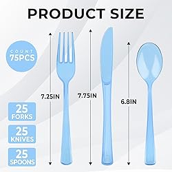 - 75 Pack Disposable Plastic Silverware, Heavy Duty Light Blue Plastic Cutlery Set Includes 25 Forks 25 Knives 25 Spoons for Birthday Wedding Party Picnics 150 Pack Disposable Plastic Silverware, Heavy Duty Light Blue Plastic Cutlery Set Includes 50 Forks 50 Knives 50 Spoons for Birthday Wedding Party Picnics