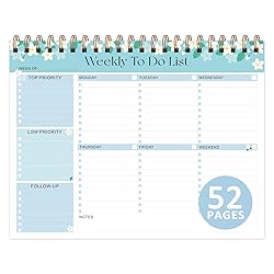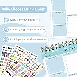 [MAXIMIZE YOUR EFFICIENCY] - The weekly to do list notepad provides an all-inclusive task management system, with classified areas for high-priority tasks, low-priorities, follow-ups, guaranteeing effective prioritization and task fulfillment. [UNDATED WEEKLY PLANNER] - Our weekly planner calendar comes with 52 undated pages, sized 11 x 8.5 inches (A4), making it easy to carry and use anytime, anywhere. It offers plenty of space for year-round planning, letting you organize your schedule without wasting pages or skipping dates. [SPIRAL BOUND WEEKLY PLANNER] - The weekly to do list notebook is made with premium covers, spiral binding, and a wear-resistant backing. It protects your pages from dirt and damage and is flexible for seamless page turning. [PREMIUM QUALITY MATERIALS] - Crafted with 100gsm FSC-certified wood-based paper, ensuring a smooth writing experience, this desk calendar planner is durable, eco-friendly, and designed for daily use. [VERSATILE USAGE] - This work planner is also an ideal gift for others, suitable for office, home, school, or personal use. It covers habit tracking, event organization, work schedules, travel plans, and more, ensuring reliability to meet all your planning needs.