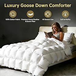 1.【All Season Goose Feather Down Comforter】-Our premium goose feather down fiber comforters expertly crafted with a 58% goose feather fibers, 33% goose down fibers, and 9% goose feathers blend for balanced warmth and durability.This all season comforters queen size is 90x90 inches and 50oz fill weight, provides medium warmth. Our duvet insert queen certified to R.D.S. Certified, Downpass and STANDARD 100 by OEKO-TEX. Perfect for year-round use in bedrooms, guest rooms, or hotel-style bedding 2.【Premium 100% Cotton Shell】-With thoughtful design, our goose bedding comforters designed with breathable natural pure organic cotton fabric for superior softness and airflow, reducing night sweats, offering skin-friendly breathable and a cozy feel. (Kind reminder:The 100% pure cotton fabric offers exceptional softness and breathability, though you may notice a mild, natural rustling sound - a characteristic of premium quality cotton.) 3.【3D Baffle-Box Design】-The baffle-box design of our goose feather fiber duvet ensures an even distribution of downfiber and feathers, securing the filling in place to maximize warmth and durability. And this comforter quilted with 8 corner tabs to easily attach duvet covers, and double-needle stitching to prevent downfiber leakage and guarantees your peaceful night's rest. To preserve warmth and extend the lifespan of this queen comforter, we strongly recommend using a duvet cover 4.【Five Sizes Avaliable To Choose】-This pure natural goose feather queen duvet insert, we offer five sizes: Twin (68"x 90"), Queen (90"x 90"), King (106"x 90", Cali King (104"x96"), Oversized King (116"x98"). Our bed comforter arrives vacuum-packed for compact shipping, so it will appear tightly compressed when first opened, allow a 1–2 inch variance when measuring upon arrival 5.【Care Instructions & Quality Promise】-This luxury white comforter queen masterfully combines comfort, breathability, organic materials, and hypoallergenic properties in one luxurious package. It comes with vacuum packaging. Please gently tap and tumble dry on low for 10 min-20min to restore its original shape. Spot clean or dry clean if necessary. Your satisfaction is our top priority. Please feel free to contact us with any concerns, and we will spare no effort to solve the problems