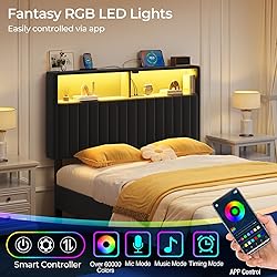 - Rolanstar’s velvet upholstered headboard features a skin-friendly, soft-touch surface and is generously filled with high-density foam for optimal comfort. It offers excellent back support while you read, browse, or unwind with your partner. The headboard features two levels of storage. perfect for storing all your bedside essentials such as phones, books, tablets, watches, and headphones. Control the LED lighting with ease using the mobile app. With over 60,000 DIY color options, you can create the perfect mood for any music or occasion. The lights can also sync to music or voice recordings for a dynamic, immersive atmosphere. The built-in USB and Type-C ports serve as a convenient charging station for your phone, headphones, power bank, gaming gear, and other devices—so you can relax in bed while staying powered up. With its modern design, this headboard adds a stylish, elevated look to any bedroom. SpecificationSize: Twin: L: 41in* W: 5.3in* H: 43.3in, Storage height: 7.1inweight: 21.4LbsMaximum weight capacity: 66Lbs Material: Velvet, Wood, MetalColor: Black
