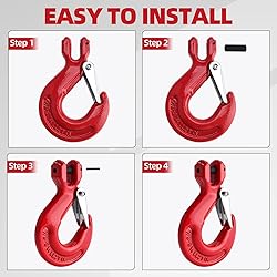 【Premium Material】The 5/16" clevis slip hook and safety chain hook are forged from high-strength alloy steel, heat-treated, and finished with a smooth spray coating for durability and reliability. 【Rust & Corrosion Resistant】Grade 80 safety chain hooks and connector links feature a red-coated surface that resists rust, corrosion, and harsh weather conditions, ensuring long service life even in heavy-duty use. 【Safe & Reliable】With an industrial-grade working load limit of 4,400 lbs, these trailer hooks offering greater safety, stability, and peace of mind during operation. 【Complete Package】 Includes 2 pcs 5/16" safety chain hooks with safety pins & locator pins and 2 pcs 5/16" link rings with pins, ready for versatile use. 【Wide Application】Ideal for strapping, towing, and lifting with most vehicles: wreckers, flatbed trailers, trucks, off-road vehicles, boats, and more. Widely applicable for factories, construction sites, farms, garages, warehouses, and roadside recovery.