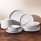 Famiware Premium Stoneware Dinnerware Sets, Plate and Bowl Sets for 4, 12 Pieces Spiral Flared Dishware with Speckles and Reactive Glaze, Microwave Dishwasher Safe Family Tableware, White