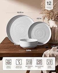PLATES AND BOWLS SET CONTAINS: The dishes set includes 4 of each: 10.25-inch dinner plates, 8-inch salad plates, and 5.5-inch cereal bowls. It is designed to meet all your daily dining and entertaining needs, from casual meals to formal occasions HANDCRAFTED WITH UNIQUE REACTIVE GLAZE: Each piece features an artisanal reactive glaze fired at high temperatures, creating one-of-a-kind patterns with natural sesame speckles and elegant spirals. This process ensures a distinctive, gallery-worthy table setting that blends rustic charm with modern sophistication FAMILY-SAFE DINNER SET: Crafted with lead-free, cadmium-free, BPA-free, and food-grade glazes, this dinnerware set is completely non-toxic and safe for everyday use, ensuring a healthy dining experience for your entire family DURABLE STONEWARE TABLEWARE: Made from high-density, premium stoneware that is thicker and stronger than ordinary dinnerware. It is highly resistant to chipping, cracking, and daily wear, built to withstand years of frequent family use OVEN, MICROWAVE & DISHWASHER SAFE: Engineered for ultimate convenience, this ceramic dinnerware set is safe for use in ovens (up to 300°C), microwaves, and dishwashers. It effortlessly transitions from cooking to serving to cleaning, fitting seamlessly into a fast-paced lifestyle PRACTICAL DISHES WITH HIGH RIM: This kitchenware features a practical flared rim that helps prevent food spills and makes lifting plates easier. The thoughtful design combines everyday functionality with an elevated dining experience SPACE-SAVING STACKABLE STORAGE: Both plates and bowls are designed with a flat, anti-slip base for secure, neat stacking. This intelligent design saves significant cabinet space, keeping your kitchen organized and clutter-free EASY TO CLEAN & STAIN-RESISTANT GLAZE: The smooth, high-density glaze creates a non-porous surface that resists stains, odors, and residue absorption FAMIWARE PREMIUM’S PROMISE: If your items arrive damaged, incomplete, or in the wrong color, we offer complimentary replacements. Reach out to us on Amazon at any time