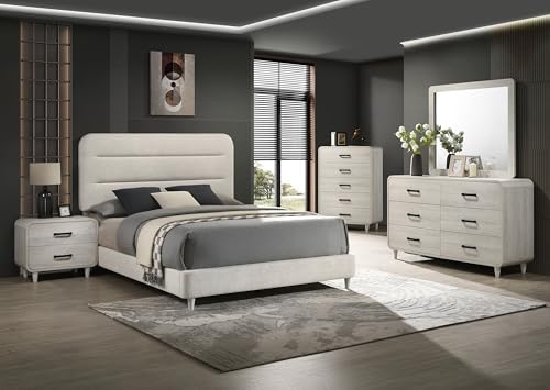 Product Features: Contemporary Style Plush, Upholstered Design Unique White Finish Strong and Durable Product Dimensions: Queen Bed: 66.9" X 84.5" X 53.9"H Dresser: 59.1" X 16.9" X 34.7"H Mirror: 43.5" X 1" X 37.4"H Chest: 33.1" X 15.8" X 48"H Nightstand: 26" X 15.8" X 22"H Product Dimensions: Transform your bedroom into a serene retreat with this contemporary ensemble, where modern sophistication meets luxurious comfort. Featuring sleek lines and a neutral palette, this group exudes elegance and versatility, perfect for any home decor. The centerpiece boasts a plush, upholstered design that invites relaxation, while matching storage solutions combine practicality with style. Elevate your living space with this harmonious blend of function and aesthetic appeal. Listing Include: 6pc Bedroom Set(Queen Size Bed, Dresser, Mirror, Chest and 2x Nightstand)Only. Mattress : Not Included Simple Assembly Require. Include curb side delivery with free lift gate service, NOTE : No inside home delivery.
