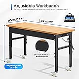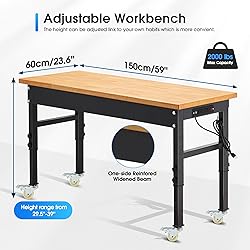 - 60'' Adjustable Workbench, 2000 LBS Load Capacity Heavy Duty Workstation with Power Outlets, Rubber Wood Top Worktable for Garage, Office,Workshop, Commercial
