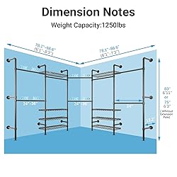Solution for Corner:Designed for corner, one side fits spaces 78.1"- 98.6" and other side fits spaces 78.1"- 86.6", this heavy duty wall mounted clothing rack maximizes storage in walk-in closets, dressing rooms, and master bedrooms, offering superior space utilization. Heavy Duty & Industrial Strength:Supporting up to 1250 lbs, this sturdy closet system is constructed with reinforced carbon steel and matte powder-coated pipes for rust-resistance, ensuring long-lasting reliability without sagging or wobbling. 3 installation methods: Fully customizable storage layout. Features 8 adjustable shelves and 4 expandable hanging rods, allowing flexible configurations like I-shape or U-shape designs to meet varied organization needs. It also comes with six 8-inch extension poles that can increase the overall height from 75 inches to 83 inches to meet varied organization needs. Multifunctional Storage Closet:Blends retro industrial pipe aesthetics with modern function, perfect as a clothes rack, ,coat rack or retail display stand in bedrooms, laundry rooms, bathrooms and corners of commercial spaces. Quick Tool-Free Assembly:Includes pre-labeled parts and detailed instructions for easy DIY installation. Easily mount this modular closet organizer without professional help.
