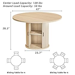 【Ideal Size and Versatile Design】The Round Dining Table measures a generous 47 inches, offering ample space to comfortably seat up to 4-6 people. This round dining table is ideal for dining rooms, kitchens, and living rooms, and can also serve as a coffee table, office desk, or for other purpo. 【Convenient Storage&Excellent Stability】 Keep your dining area tidy with a spacious double-layer shelf discreetly built beneath the tabletop. Ideal for storing cutlery, napkins, and kitchen essentials, it keeps everything organized, keeping them within easy reach. The oversize round base disperses the center of gravity and has higher stability. 【Elegant and Durable】Crafted from high quality MDF and wood veneer capable of holding up to 330 pounds , the tabletop and wood strip base provide lasting durability and an elegant modern farmhouse aesthetic transforming each meal into an enjoyable experience. The sealed tabletop is water resistant and easy to clean with a damp cloth, protecting against scratches and spills. 【Comfortable Seating Space】The 47 inch circular Tabletop provides ample seating and legroom for up to 4-6 diners yet does not overwhelm smaller spaces. At just 47 inches across.The open base also lets you neatly tuck in chairs or stools, helping you save space when not in use. Its compact yet functional design is perfect for kitchens, apartments, and smaller dining areas. 【Easy to Assemble】 The package contains clear instructions and labeled parts, so you can quickly install this table. If you have any questions, please contact us and we will solve your problems within 24 hours.