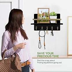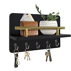 KISENG Key Holder Wall Mount, Decorative Key Rack with Shelf & 5 Sturdy Hooks, Rustic Key Hooks for Wall for Mail Organizer Hanging Dog Leash, Glasses, Wooden Key Hanger with Mounting Hardware