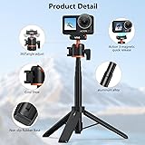 [Designed Specifically for DJI Osmo Camera]: The Quick Release Tripod fully compatible with DJI Osmo Action 5 Pro, Osmo Action 4, Osmo Action 3, and Osmo 360(when in single lens mode), easy to install, secure buckle, ensuring device safety [Tripod and 360° Ball Head]: The built-in tripod stand at the bottom securely holds the device in place for stable shooting. The selfie stick's grip handle features added silicone pads for a comfortable hold and excellent slip resistance. The 360° ball joint design at the top allows for quick and easy angle adjustment [Four-stage Telescopic Adjustment]: The selfie stick tripod extension rod can be extended to any length between 20 cm and 54 cm (8.07 to 21.3 inches). It is retractable, portable, and lightweight, and can be stored in backpacks and travel bags [Integrated Quick Release Mount]: The mini extension rod equipped with a quick-release base, eliminating the need for traditional knob operations and enabling one-step installation. The dual lock design enhances safety and convenience [Cold Shoe Expansion Interface]: A cold shoe slot has been added to the side of the ball head, allowing for the attachment of a light or microphone stand. Easily handle indoor and outdoor scenarios such as vlogging and live