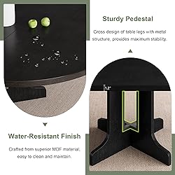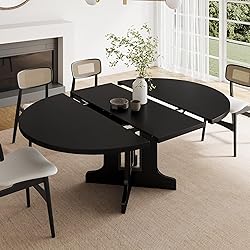 Extendable Dining Table: Featuring with expandable design, allows the table to expand up to 59" to comfortably seat 4-6 people, also provides ample space for tableware, yummy food and drinks (Chairs not included) Exquisite Craftsmanship: The table boasts an MDF top and a sturdy pedestal, steadfast and stable, infusing your dining times with a serene and comforting ambiance. Maintenance is a breeze with a simple wipe-down Thoughtful Rounded Design: The circle dining table's rounded edges, not only gently protect your kids from bumps, but also beckon relatives and friends closer to sit, sharing in the boundless joy of every gathering moment Mid-Century Style: With its pristine lines and sophisticated aesthetic, the dinner table blends seamlessly into any interior décor, making it a versatile piece for dining, conferencing, office work, and more Easy Installation: Come with comprehensive guides, only 30 minutes to complete the assembly. Dining table dimensions: 43.3"L(Standard) - 59.1"L(expanded) x 43.3"W x 29.6"H | Tabletop: 1.2"T. Weight Capacity: 300lbs