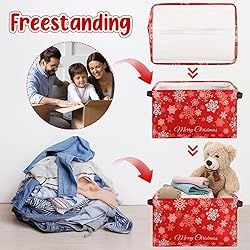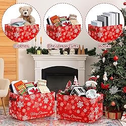 Package Includes: you will receive 2 pcs Christmas storage baskets measuring about 14.2 x 10.2 x 8.3 inches/ 36 x 26 x 21 cm to easily fit in closets, shelves, or under tables; These large Christmas baskets can provide ample space for organizing your holiday essentials, and ideal for storing ornaments, toy, blankets, or even gifts Quality Materials: this Christmas empty gift basket is made of durable canvas, and the metal rod frame around the top maintains its shape; The sturdy faux leather handle provides a strong and comfortable grip for easy carrying; Offering a nice solution for both decorative and functional needs Foldable Design: easily collapse the Christmas baskets when not in use to save space, making storage a breeze; It can also be applied as a storage basket and placed wherever you need it Stylish Christmas Themed: our Christmas storage boxes feature a modern and stylish snowflake pattern and "Merry Christmas" letters; The classic red color and snowflake design create a rich Christmas atmosphere; It's both decorative and practical, and you will like it Widely Applicable: this Christmas storage bin meets a variety of storage needs and is suitable for home, office, nursery, and car trunk; You can use it to organize and store clothes, shoes, pet supplies, toiletries, laundry, bedsheets, sports equipment, etc., or place it anywhere in your home, such as the living room, bedroom, bathroom, utility room, laundry room, etc