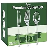 HEAVY-DUTY CLEAR DESIGN: Crafted from extra-strong, food-grade PS plastic, our transparent cutlery features reinforced edges for exceptional durability. Resists bending and breaking effortlessly—knives cut through food without snapping, and spoons handle both hot and cold liquids with ease. The ergonomic handles provide a comfortable, secure grip for any meal. SAFE & COMFORTABLE TO USE: Made from premium plastic material, this cutlery set is completely safe for contact with food. It reliably withstands temperatures from -22°F to 212°F, making it perfect for hot soups or chilled desserts without warping or melting. Each piece has a smooth, burr-free finish for a comfortable and safe dining experience. VERSATILE FOR ANY OCCASION: The crystal-clear, minimalist design elegantly complements any table setting or theme. An ideal, hassle-free solution for large gatherings—from holidays like Christmas and Thanksgiving to birthdays, picnics, and BBQs. Simply use and dispose to skip the tedious cleanup and focus on enjoying your event. 300 PIECES IN TOTAL: This all-in-one disposable flatware set includes 100 forks, 100 spoons, and 100 knives—perfectly sized for parties, family reunions, weddings, or catering events. It offers ample supply for event planners, small businesses, and savvy hosts who value both quality and convenience without the high cost. ULTIMATE CONVENIENCE: Designed for single-use to save you valuable time and effort on washing up. After the party ends, just throw them away. This hassle-free cleanup allows you to fully immerse yourself in the joy of hosting and spending quality time with your guests, making every event more enjoyable.
