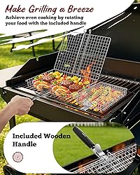 - Nesting Grill Baskets, 2PCS Grilling Baskets for Outdoor with Removable Handle, Stainless Steel BBQ Camping Cooking Accessories Tools for Meat Steak Fish Vegetable Shrimp, Gifts for Men Dad Husband Dual-Sized Nesting Baskets: Our two differently sized grill baskets are designed to effortlessly cook a variety of foods, from thick steaks to various types of seafood and vegetables. With an innovative nesting design, storage and transport are simplified. The smaller basket neatly fits into the larger one, along with detachable handles and accessories, optimizing space in your kitchen or on-the-go Reduce Mess and Food Waste: Say goodbye to food falling through the grill grates! Our grill baskets feature a secure-latch design, keeping your ingredients in place while grilling. This ensures a tidy grilling experience, minimizing mess and waste. Easily open the secure latch to access your perfectly grilled food without any hassle Easily Flip with Detachable Wooden Handle: Enjoy effortless grilling with our grill baskets' detachable wooden handle. The handle is easy to lock and unlock, providing both convenience and safety to avoid burns. Easily flip your food for even and high-efficiency heating, allowing you to spend more time enjoying your grilled delights with friends and family Sturdy Stainless Steel Construction: Our grill baskets are crafted from quality stainless steel, with tightly woven meshes and robust welding points. This ensures durability and prevents food from falling through. The baskets are heat-proof and easy to clean, dishwasher-safe for effortless maintenance. Experience the superior blend of strength and hygiene in every grill session Practical and Thoughtful Present: From backyard barbecues to camping trips, our grill baskets are your versatile cooking companion. Meticulously designed and packaged, this set is sure to impress your friends and family. It’s more than just a practical tool—it’s a present that brings joy and convenience to any grilling enthusiast’s culinary adventures