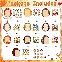 - Fall hedgehog craft kit is a fun and creative parent-child manual activity, specially designed for children to create their own artistic time in autumn. The overall design incorporates a lot of autumn elements, such as maple leaves, pumpkins, mushrooms, oak leaves and acorns, etc with the cute hedgehog shape, which well presents the warm atmosphere of autumn. Fall paper crafts kits are not only suitable as a manual project of family interaction, but also ideal for school classrooms, holiday parties, community activities and other scenes. Each fall hedgehog craft kit contains rich materials: 30 hedgehog cards, 30 accessories stickers, 30 ribbons and a detailed illustration. The card is made of thick cardboard, smooth and not easy to tear, with smooth surface, and the sticker comes with adhesive, which is convenient to use and suitable for children to easily complete collage creation. The way of use is also very simple. Children only need to choose stickers according to the diagram, or freely combine the accessories. After finishing, they can hang autumn crafts for kids on windows, doors or bookshelves with ropes, which can not only be used as autumn decoration, but also show their achievements. Fall crafts are not only an entertainment activity, but also a growing experience, which helps children improve their hands-on ability, creativity and teamwork awareness. Every finished autumn crafts for kids contains children's understanding and expression of autumn, which is a meaningful artistic creation process. Whether at home or in the classroom, fall hedgehog craft kit can bring full joy and a sense of accomplishment.