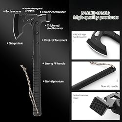 - 【5-in-1 Survival Hatchet】This tactical hatchet serves as a survival axe, hammer, bottle opener, wrench, and climbing carabiner. Its military-grade construction makes it ideal for camping and survival scenarios, from splitting kindling to emergency rescue operations. 【Ultra-Sharp & Durable Blade】Forged from high-carbon steel with a sharpened edge, this survival hatchet axe delivers clean cuts through firewood, rope, and debris. The anti-corrosion coating ensures long-term reliability in harsh outdoor conditions. 【Dual-Head Hammer & Axe Design】 The hatchet hammer combo features a hammer head for pounding tent stakes and an axe blade for wood processing. This tactical tomahawk design is optimized for backpacking, bushcraft, and survival tasks." 【Portable with Sheath & Hook】Weighing under 2 lbs, this backpack axe includes a camping axe sheath for safe carry. Its compact size fits in backpacks or survival kits for hiking, EDC, or tactical missions." 【Perfect Outdoor Gift】This survival tomahawk is a functional present for adventurers. Suitable for camping, hiking, trekking, backpacking. Offer this gift and they will be impressed by your choice!