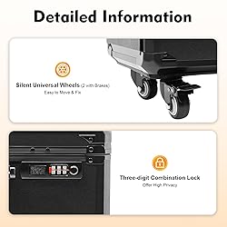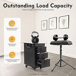【Premium Materials】: This product is made of high-quality manganese steel, acrylic, and PU, which is wear-resistant, and not easy to fade, ensuring a long service life. 【Freestanding Workstation】: This product includes a removable tripod with a top soft cushion to be used as a hand bracket for your nail polishing or more. The height can be adjusted with a knob for added convenience. The acrylic panel on the top of the case also allows you to place some work necessities for easy access. 【Outstanding Load Capacity】: The rectangular structure and high-quality materials give the case an excellent weight capacity (up to 44.09 lbs). You can put all your hair and beauty tools in it with confidence. 【Categorized Storage】: This product is designed with three side drawers and a top compartment, allowing you to organize products of different functions and sizes such as perms, hair curlers, brushes, cosmetics, scissors, and other essentials while making it easy to find the items you want quickly. 【Flexible Movement】: The easy-to-move silent universal wheels (2 with brakes), 2-gear telescopic pull rod, and a case body handle make it easy to move the case up and down stairs, in and out of the car, and in the lift.