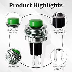 Size:Green mini push button switch diameter 7.5 mm/0.3in, mounting diameter 10 mm/0.39in, total height 26.4 mm/1.04in, 2-pin length 6.6mm, pin spacing 3.8mm; rated current/voltage: 0.5A 250VAC; contact type SPST Material:Push button switch shell is made of rigid plastic, featuring dielectric strength of 1500VAC/1min, perfect operation at -45 ℃~95℃ environment; pins are premium alloy, with excellent conductivity to ensuring stable circuit connection Instant Response:Self-resetting design, turns on when pressed and resets to off immediately when released, with sensitive response and no delay; electrical life up to 10010 cycles, maintaining stable performance under high-frequency use, safe and reliable Easy to Use:Insert the latching push button switch into the 10mm hole on the panel, secure with the accompanying nuts and washers, connect the positive and negative poles to complete the installation Applications:Mini momentary push button switch suitable for use as a led light switches, vehicle ignition, horns switch, doorbells,home appliances buttons; Widely used in small instruments, Arduino projects, physical experiment, lighting control, etc.