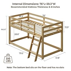 Sturdy Pine Wood Construction: This wooden bunk beds twin over twin is made from eco friendly solid pine wood, with 250 lbs capacity on the top bunk; the floor bunk bed also supports parents for bedtime company Safe Sleeping Design: This low bunk bed for kids features a toddler floor design for children under 6, with strong guardrails and wide stairs; climbing is easy and the sleeping area is safer LED Lighting Support: The upper bunk blocks light and makes the lower space dark; this floor bunk bed comes with a bright LED strip that creates clear lighting for reading or play, friendly to kids' eyes Multi Functional Use: These bunk beds for kids allow the lower bunk to be set as a play zone or storage; LED light adds atmosphere; 6 hooks can be arranged in different positions for extra storage options Easy Use and Support: The toddler bunk bed fits mattress size 75 × 39 in, with inner size 76" L × 39.3" W; clear instructions are included; if you have any questions during assembly or use, please contact us anytime Note: The bottom bed sits on the floor and has no slats, and pine wood works well with self-tapping screws, creating a stronger, more secure structure without pre-drilled holes