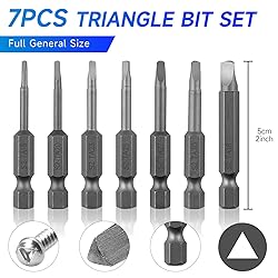 Precision-Engineered Sizes: TA18 to TA46:This set includes the most commonly used triangle bit sizes: TA18, TA20, TA23, TA25, TA27, TA30, and TA46, allowing you to handle various repair tasks with confidence. Whether working on small electronics or larger appliances, you'll have the right size at hand. Industrial-Grade S2 Alloy Steel Construction:Crafted from high-performance S2 alloy steel, each triangle screwdriver bits is forged and heat-treated to deliver 58-60HRC hardness, offering long-lasting durability and strength. Built to withstand heavy torque loads while maintaining sharp edges. Built for Heavy-Duty Tasks – Compact & Organized:This triangle bit set is built to endure repetitive use in high-stress environments, while remaining compact for easy storage and transport. Ideal for workshops, toolboxes, or home repair kits. Ultra-Strong Magnetism for Secure Screw Hold:Each triangle bit features magnetization for secure screw holding, making it easier to insert, remove, or adjust screws without slipping or dropping. Ideal for fast-paced repair jobs where precision and control matter. Versatile Use Across Household & Professional Repairs:Designed for a wide range of applications, this triangle bit set is perfect for power tools used in appliance repair, electronics, toy assembly, computer maintenance, auto work, kitchen appliances, and other household projects. A must-have for DIYers, technicians, and repair pros.