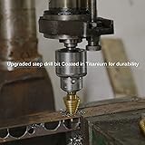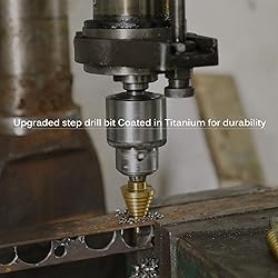 HSS Titanium Coating: The step drill has excellent sharpness and durability due to its high speed steel material and titanium coating 135° Split Point Tip & Dual-flute Design: increases cutting speed with self-centering and prevents walking, clears chips faster and allows particles to escape easily 50 Sizes in 5 Pcs: The step drill bit kit includes 5 standard pieces with totally 50 sizes for versatility, enough for your DIY needsWidely Application: Ideal for drilling holes in plastic, aluminum, iron and many other types of sheet metal (Not recommended for stainless steel & wood) Keep Your Step Drill Bits Well Organized: All the bits come in a well-organized case for easy transport and storage