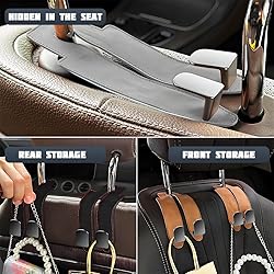 - Specifications: Material: metal, suede leather Color: black, gray, brown Size: height: 6.7 inch, top width: 1.77 inch, base width: 3 inch Weight: 50g/1.76oz Package Include: 2pcs car headrest hook Why you need our product? -Multi Functional: This product not only serves as a storage solution but can also transform into a phone stand. When not in use, it can be neatly stored away. -High Load Capacity: This product can securely hold heavier items, meeting daily needs for hanging backpacks, shopping bags, and other heavy objects.