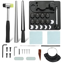 - Features of AMGSH Ring Bender Tool Kit: Complete Ring Bender Tool Kit: Includes all the essential tools you may need for making rings or other metal accessories. It includes 1 x Ring Bending Tool with 8 different size dies and posts (60°, 90°, 12mm, 14mm, 16mm, 18mm, 20mm, 22mm) and extra 5 polymer dies for softer metals, which won’t leave marks. (12mm, 14mm, 16mm, 18mm, 20mm), 1 x Rubber Jewelry Hammer, 1 x Metal Steel Ring Mandrel, 1 x Ring Sizer Mandrel, 27 x Ring Round Models, 1 x Black Ring Sizer Belt, 1 x White Ring Sizer Belt, 1 x Agate Burnisher, 2 x Silver Polishing Sticks and 2 x Silver Polishing Cloths for measuring your own ring size. Durable and High-Quality Construction: Built for long-lasting performance, this ring bending tools and tools are made from premium materials to handle frequent use. Versatile Jewelry Making Kit: Not just for rings, this kit is perfect for making earrings and bending other metal parts, offering flexibility for various jewelry-making tasks. Easy to Operate & Save the time and energy: Just place the appropriate size of post and die in the tool, put the metal wire in the gap between the die and post, rotate the handle to press and bend the wire until the ring takes shape. Quickly and easily make your rings, saving your precious time and energy, especially when you need to work on multiple pieces. Package List of AMGSH Ring Bender Tool Kit: 1 x Ring Bending Tool includes 8 different size dies and posts (60°, 90°, 12mm, 14mm, 16mm, 18mm, 20mm, 22mm) and 5 non-marring polymer dies for softer metals.(12mm, 14mm, 16mm, 18mm, 20mm) 1 x Rubber Jewelry Hammer 1 x Metal Steel Ring Mandrel 1 x Ring Sizer Mandrel 27 x Ring Round Models 1 x Black Ring Sizer Belt, 1 x White Ring Sizer Belt 1 x Agate Burnisher 2 x Silver Polishing Sticks, 2 x Silver Polishing Cloths Screws for attaching the bender securely to your workbench. Specifications of AMGSH Ring Bender Tool Kit: Ring Bending Tools: 15.2*7.3*4.9(cm) / 5.98*2.87*1.93(inch). Including 12mm, 14mm, 16mm, 18mm, 20mm, 22mm, 60°, 90° dies & posts, and extra 5 polymer dies for softer metals without leaving markers. Rubber Jewelry Hammer: 9.5”/ 24.13cm L x 2.4”/6cm Hammerhead Width Metal Steel Ring Mandrel: 10.13”/25.73cm L x 0.88”/2.24cm Bottom Diameter Ring Sizer Mandrel: 10.25”/26 cm L 27 Ring Round Models: EU Scale: 36.4~70.1 / 11.58mm~22.32 / US Scale 0A~13.
