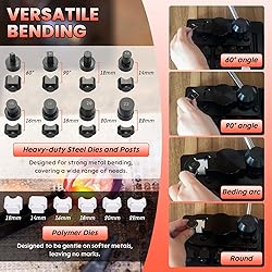Complete Ring Bender Tool Kit: Includes all the essential tools you may need for making rings or other metal accessories. It includes 1 x Ring Bending Tool with 8 different size dies and posts (60°, 90°, 12mm, 14mm, 16mm, 18mm, 20mm, 22mm) and extra 5 polymer dies for softer metals, which won’t leave marks. (12mm, 14mm, 16mm, 18mm, 20mm), 1 x Rubber Jewelry Hammer, 1 x Metal Steel Ring Mandrel, 1 x Ring Sizer Mandrel, 27 x Ring Round Models, 1 x Black Ring Sizer Belt, 1 x White Ring Sizer Belt, 1 x Agate Burnisher, 2 x Silver Polishing Sticks and 2 x Silver Polishing Cloths for measuring your own ring size. Compact yet Heavy-Duty: Despite its compact size, this ring bender tool is heavy, well-built, and extremely solid, making it perfect for any workshop or workbench. It features a handy storage base, allowing you to keep all the tools neatly in one place. The tool can be securely fastened to your workbench using the included screws, or you can store everything neatly inside the base for easy organization and portability. Easy to Operate & Save the time and energy: Just place the appropriate size of post and die in the tool, put the metal wire in the gap between the die and post, rotate the handle to press and bend the wire until the ring takes shape. Quickly and easily make your rings, saving your precious time and energy, especially when you need to work on multiple pieces. Two Sets of Dies for Versatile Bending:This Ring Bending Tool includes a set of heavy-duty steel dies (60°, 90°, 12mm, 14mm, 16mm, 18mm, 20mm, 22mm) for strong metal bending, and extra polymer dies (12mm, 14mm, 20mm, 22mm) which are gentle on softer metals and won’t leave any marks. Wide Application: This ring bending tool is not only perfect for making rings, but also includes 60° and 90° dies, allowing you to create a variety of shapes for rings, earrings, and other accessories. Ideal for both DIY enthusiasts and professionals, it offers versatile options for jewelry crafting. For best results, it’s recommended to work with metals that are less than 3mm thick.