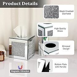 💗Attractive &Sturdy - The stunning tissue box cover is made of high quality artificial crystal + glass, the silver shiny material makes the tissue box cover gorgeous and stylish. 💗Elegant & Glamorous - This tissue box holder has a very sleek and luxe look, it's not only a tissue holder in you home, but also a pretty and bling decoration to any place you put, will add a nice decorating touch to your home without being too chintzy. 💗Widely Application - The luxurious crystal glass tissue box can not only be used in your home like: bathroom, vanity, dresser, night stand, table, countertop, but also perfect as wedding table centerpiece or venue decoration. And it's really an Ideal Gift for House warming, Wedding, Anniversary, Special Occasions, Christmas, New Year!!! 💗Magnetic Bottom Design - The magnetic bottom design allows for easy replacement of empty tissue box - just nned to remove the magnetic base plate and lift the cover and place a new tissue box underneath. The bottom plate has 4 magnetic points to help you close your tissue dispenser. 💗Size Information - External Dimension: 6 x 6 x 6.1 inch(L x W x H);Item size has been marked in the picture in detail. Great for any countertop such as nightstand, end table, bathroom vanity, kitchen counter, dresser, coffee table, shelf, office desk and so on.