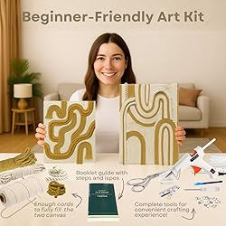 Create Simple Yet Unique Rope Canvas or Combine Some Macrame Art - Do not limit your creativity! Make decoration personal and transform your space with your own handcrafted, beautiful Macrame Rope Art Canvas decor. You can hang it, put it on a shelf or frame it! Craft Instagram-worthy pieces that spark conversations when guests visit. Each boho artwork makes your home feel warm, authentic, and one-of-a-kind — because the best spaces are personal ones. Complete & Ready to Use Kit - Create 2 pieces of macrame wall hanging kit includes macrame ropes, 12 x 16" and 10 x 11.8" stretched canvas board set with hanger, scissors, sticking and measuring tools and accessories. Just sit down, unbox, and start right away; no extra supplies or skills needed! Beginner-Friendly Activity to Relax & Unplug - Designed especially for beginners, this kit comes with a Macrame Rope Canvas Guide booklet with detailed step-by-step instructions and an inspiration gallery that makes learning simple, relaxing, and rewarding. You can take a break, do it slowly, or craft in your free time. Multi-size & Multi-color Macrame Rope Supplies - Craft with confidence using high-quality 100% cotton ropes that are soft to the touch yet strong and durable. Comes with Natural Off White base color ropes in 3mm, 5mm, and 10mm thickness and accent color Khaki in 5mm and 8mm thickness. Easy to cut, shape, and glue, these ropes make your creative process smooth and enjoyable — perfect for crafting sturdy, beautiful macrame art that lasts. Versatile Color Combinations for Every Home Style - Match your macrame art to your home’s aesthetic with three thoughtfully curated accent color options paired with the Natural Off White-colored base ropes: Khaki for cozy, rustic, or boho interiors; Black for modern, minimalist, or industrial spaces; and Green for nature-inspired, earthy, or serene settings. Each combination enhances your décor with balanced tones, texture, and warmth — perfectly complementing any home style. Unique Gift Idea - The macrame starter kit or your finished macrame wall art makes a thoughtful and special gift. You may also share the experience with loved ones — craft together, slow down, and enjoy meaningful moments of connection. Or, take time for yourself to unwind with a mindful weekend DIY session and create a beautiful macrame canvas art piece you’ll be proud to display. Plus, once your masterpiece is complete, you can reuse the tools for future DIY projects — giving you lasting value beyond one craft session.