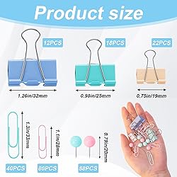 - 🎯Upgrade Your Desk with a Complete Pastel Office Set Our 260-piece kit features paper clips assorted sizes, multi-size binder clips, and push pins (aka thumb tacks) in a soothing pastel color palette. Housed in a transparent grid box, it's the ultimate organization solution for teachers, students, and office professionals. ✨Key Features & Benefits Assorted Sizes for Every Task - From small paper clips to large binder clips, this set handles everything from single pages to thick stacks. Bulletin Board Ready - Includes 88 round-head push pins for securing notes and decorations on corkboards. Neat & Tidy Storage - The clear plastic case with compartments keeps your desk organized and clips easy to find. Soothing Pastel Aesthetic - The muted colors reduce visual clutter and create a calm, cute workspace. 🎁 Perfect For ✓ Teachers - Essential teacher desk supplies for grading, classroom boards, and student activities. ✓ Students & Dorms - A college essentials kit for keeping notes and study materials sorted. ✓ Home Office - The perfect desk accessories set for women and remote workers. ✓ Gift Giving - An ideal teacher appreciation gift or back-to-school present. 📦What's Included Paper Clips: 120pcs (Small & Medium Sizes) Binder Clips: 52pcs (Small, Medium, Large Sizes) Push Pins / Thumb Tacks: 88pcs 1 x Transparent Storage Box Order your complete pastel office supplies set today and organize your workspace in style!