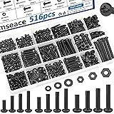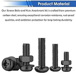 Package: You will receive 516pcs black bolts and nuts Assortment kit,including 13 sizes screws,4 sizes nuts and 4 sizes flat washers,meet your needs in daily life Material: Our Screws Bolts and Nuts Assortment kit is crafted from premium carbon steel, ensuring exceptional corrosion resistance, rust-proof qualities, and oxidation protection for long-lasting durability Precision Engineering: Experience the difference with our meticulously crafted bolts and nuts kit; the smooth, clean threads ensure precision and ease of use while the tightly rolled threads resist deformation and slipping during application Convenient Storage: M3, M4, M5, and M6 screws, bolts, nuts, and washers are neatly organized in a plastic storage box, making it exceptionally easy to store, access, and transport wherever you need your nuts and bolts machine screws Versatile Application: This nuts and bolts assortment kit is perfect for a wide range of uses, including machinery, furniture, automotive, motorcycle repairs, communication tools, electrical facilities, electronics, ship assembly, and DIY projects
