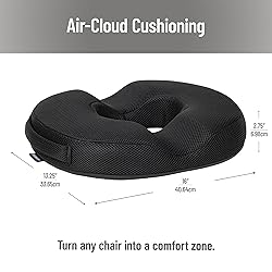 - Donut Pillow with Air-Cloud Technology for Pressure Relief & ComfortExperience soothing relief and long-lasting comfort with the Mind Reader Donut Pillow Seat Cushion. Designed with a center hole and ergonomic “U”-shaped cutout, this high-density Air-Cloud memory foam cushion reduces pressure on the tailbone and hips while evenly distributing body weight. It’s ideal for postpartum recovery, hemorrhoids, sciatica, and long hours of sitting at a desk or in a vehicle. The breathable mesh cover promotes airflow and is removable for easy washing. Lightweight and portable, this cushion has a handle and can be used at home, in the office, on an airplane, or in a car. Whether you're recovering from surgery or looking to improve posture during daily activities, this cushion delivers targeted support wherever you need it.