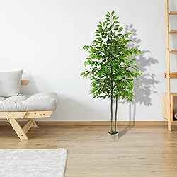Thoughtful and Superior Design: This artificial ficus trees indoor comes complete with a durable warm-white planter and realistic moss—no extra purchases needed. The planter features two robust artificial ficus trees with highly authentic trunk shapes and textures. The lush leaves and branches are vividly crafted in natural tones, seamlessly blending into any home or office environment. Premium Materials, Long-Lasting Beauty: Crafted from high-quality silk, plastic, and stainless steel, this faux ficus tree boasts lush foliage that won’t fade or deform. The branches are embedded with bendable wires, allowing you to customize the tree’s shape. The solid cement pot provides stability to prevent tipping, supports string lights. Zero Maintenance, Evergreen All Year Round: No watering, trimming, or sunlight needed! This tall artificial plants indoor is the ideal choice for plant lovers with busy schedules or limited time for upkeep. Perfect for hectic lifestyles and commercial spaces. Perfect Home Décor: Enhance your living room, bedroom, entrance, hallway, or office with this lifelike artificial plants. It’s pet-friendly and safe for all ages. Add a refreshing touch of green to energize your space naturally. This fake tree also beautifully complements festive settings like birthdays, Christmas, Thanksgiving, and New Year’s celebrations. Dimensions & Specifications: Artificial tree overall dimensions: 70” H x 35” W x 35” D.