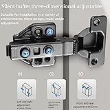 .{Gun black frameless cabinet hinge}: Made of cold-rolled steel stamping for one-time qualitative use, suitable for use in dry environments, flexible adjustment, three-way adjustable, easy to install. .{Size of hinge cup slot}: hinge slot diameter: 35mm, hinge cup depth: 11.5mm, hinge cup head screw hole distance: 48mm, suitable door thickness: 16-21mm. Side plate 16-21mm .{Only applicable to frameless cabinet doors}: 105 degree opening angle, fully covered concealed hinge application frameless fully covered cabinet door application installation .{Soft Close and Open}: Soft close function with buffering system, hydraulic buffering plugin, used for automatic deceleration and ultra quiet closing, providing excellent silent experience when closing doors at small angles. Easy to install, with CLIP-ON function, hinge body and bottom can be installed separately .Suitable for frameless cabinet doors, cabinets, wardrobes, garage storage cabinets or other furniture frameless cabinet doors