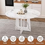 - 47.2" Round Dining Room Table, Wood Kitchen Table with Trestle Base, Farmhouse MDF Table with Marble White Finish, Easy Assembly