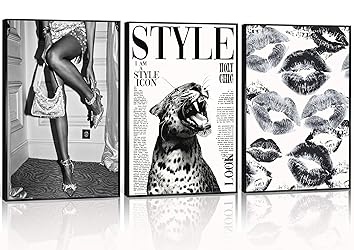 Blak and White Fashion Girl Wall Decor: have two sizes: 12X16 inches (Unframed) and 16X24 inches (Unframed) Please note these posters are Unframed,Please measure your wall and choose the appropriate size. Blak and White Trendy Cheetah Home Decor: fusion of classic and trendy aesthetics blends black and white retro textures with modern fashion. The combination of leopard print,roaring leopards,sexy lip prints,beautiful legs,high heels,and newspaper elements creates a wild and fashion girl style,injecting a timeless trend into the home. Trendy Heels Lips print Poster: This set of 3pcs wall art Canvas decorative painting is a great wall decoration for girls and is very suitable for Preppy decorating dormitories apartment bedrooms study rooms living rooms and other spaces. Thoughtful Gift:Whether it is for,holidays,housewarming parties,Like birthday gift Mother's Day wedding anniversary business housewarmingt thanksgiving day Halloween Christmas getc.it is a great gift for your lover family,classmates and friends. After-sales service: We attach great importance to your shopping experience. Customer satisfaction is our greatest pursuit. If you have any problems with the posters you purchased, you can contact us as soon as possible to solve your problems for you without any worries.