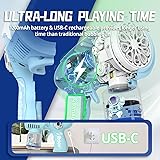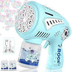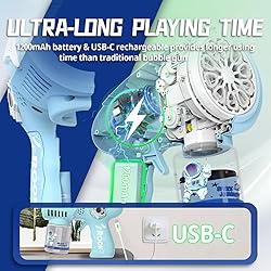 Unique Bubble Gun with Larger Bubbles - Experience next-gen bubble magic! Our 10-hole bubble gun outperforms standard bubble blowers by creating bubbles 30% larger, while the powerful motor generates massive bubbles storm Pure Bubble Joy, No Power Fuss - Skip the AA replacements! This kids' bubble machine has a built-in rechargeable design (USB-C charging) for longer continuous fun. Safer and longer-lasting than traditional powered blasters LED Light Extravaganza After Dark - The bubble blower transform nighttime play into a glowing spectacle! LEDs illuminate bubble trajectories, creating hypnotic colorful bubbles world that captivate kids alike 360° Leakproof Bubble Maker Design - No sticky chaos! Spill-proof technology lets kids tilt, shake, and twirl this bubble machine freely. The thickened bubble solution tank withstands even the wildest playstyles while maintaining steady output Ultimate Party Bubble Blaster for Events - Turn celebrations into fairy tales! This bubble machine creates worthy moments at birthdays/weddings/parades. Comes gift-ready packaging - ideal toy gift choice for Easter baskets, Halloween, outdoor and summer carnival favors, tollders kids age 3 4 5 6 7 8 Smart Maintenance for Long-lasting Bubble Fun - Pro Tip: After use, simply dip the tube in water 120s and pull the trigger for self-cleaning. Avoid clogging and extrend the bubble gun's lifespan
