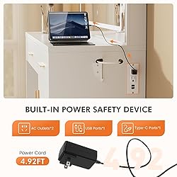 - Meet your new beauty bestie—the Sweetcrispy Dressing Table! This isn't just a mirror; it's your all-in-one glam station designed to make every day feel like a spa day. Start with the ultra-clear 35-inch LED mirror that features three types of light—cool, warm white, and yellow. Adjust the brightness smoothly with a simple long press, whether you’re applying makeup in the morning or winding down at night. Never worry about dead devices again! With built-in AC outlets, USB, and Type-C ports, this vanity keeps your phone, hair tools, and tablet powered up and within reach. The extra-long power cord offers freedom to set up anywhere. Tidy meets trendy with two spacious drawers and a large cabinet that swallow all your skincare, makeup, and accessories. Plus, the side hair dryer holder helps you ditch cord chaos forever. Crafted from high-quality MDF, Sweetcrispy’s dresser is sturdy, stable, and built for daily use. Plus, assembly is a breeze with clearly labeled parts. Whether you’re upgrading your space or surprising a loved one, this dressing table makes a perfect gift for birthdays, Christmas, or just because!