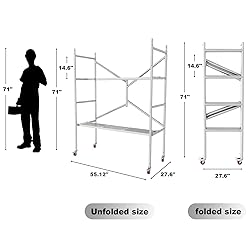 800lbs Load-bearing Capacity: foldable scaffolding platform is made of thickened galvanized pipes and key connecting components are welded and reinforced. The single platform can support a weight of up to 600lbs and can safely accommodate 2-3 adult workers and tools and equipment at the same time Size Description: The unfolded size of adjustable work platform is (LxWxH): 55.12 "x27.6" x71 ", height 71" is the height without wheels, height with wheels is 76.8 ", and the size of a single layer board is 55.12" x11 "x1.6" 4-Tier Height Adjustable: mobile scaffold ladder has 4 adjustable height settings, with a spacing of 14.6 "/37cm between each layer, to adapt to different heights and needs of work Folding and Portable Mobility: rolling scaffold adopts a foldable design, which can be folded when not in use, suitable for transportation and storage in narrow spaces; scaffolding set is equipped with 4 universal heavy-duty casters with dual brakes, which can be easily moved and positioned in real-time (the casters are detachable, you can choose to use or not use them) Multi Scenario Adaptation: The scaffold pedal adopts a square tube punching design to increase Slip resistance, and the thickened pipe has an anti rust coating, which can withstand harsh construction environments. Suitable for indoor and outdoor use such as construction, interior painting, event scenery, ceiling maintenance, and installation of lighting fixtures