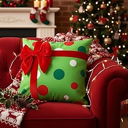 - Features: 4 Christmas dots bows cushion decor in assorted designs, each adorned with 3D velvet bows. Inspired by classic red and green tones with a playful lime green-elf charm, these Xmas winter decorative cushion covers transform sofas, chairs, or beds into lively holiday gift boxes (inserts not included). Soft Fabric & Easy Care: made of quality polyester plush that feels cozy and smooth, these Christmas throw pillow cushion covers resist fading, fraying, or color bleeding. While the neat stitching and handmade craftsmanship provide a snug fit that enhances the overall look of your festive décor. Machine washable for hassle-free upkeep Specifications: Material: polyester plush Color: red, green Size: 18 x 18 inches Package includes: 4x Christmas throw pillow cases with 3D bows Notes: Manual measurement, please allow slight errors on size. The color may exist a slight difference due to different screen displays