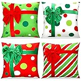 Polyester Plush Playful Christmas Pillow Cases Set: you will receive 4 pieces of Christmas gift box style pillowcases in assorted designs, each featuring 3D velvet bows; With bright red, green, dot, stripe patterns, these Christmas cushion decor add a lime green touch of fun and cheer to your seasonal decor; Pillow inserts are not included Classic Gift Box Design: designed with red and green stripes, polka dots, decorated with a 3D velvet bow, each Christmas pillow case cover resembles a wrapped Christmas gift; They create a cute look of presents stacked around your living room, full of holiday charm and playful elf whimsy Quality Fabric and Easy Care: made of soft polyester plush, these holiday pillow covers deliver a smooth and cozy feel; Resistant to fading, fraying, and color bleeding, these Xmas winter throw pillow cases remain reliable and serviceable throughout the holiday season; Machine washable for easy care— wash white clothes separately Standard Size: each merry Christmas pillow cover measures approx. 18 x 18 inches, fitting most square inserts; A hidden zipper ensures an elegant appearance, fold the pillow insert in half, tuck into the cover, flatten the 4 corners and zip shut, they'll elevate your holiday decorations; Note: 0.5-1 inch size deviation allowed due to handmade craftsmanship and sewing Versatile Christmas Decor: these red green Christmas cushion covers are suitable for sofas, couches, benches, beds, or even office chairs; Whether for cozy family gatherings, Christmas nights, or red green themed parties, they instantly enrich the winter atmosphere across different settings