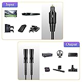 Optical Splitter 1 in 2 out: The optical audio splitter can connect one optical fiber signal input device, then by fiber optic splitter output to 2 sets Optical/TosLink/ SPDIF audio output device Hi-Fi Sound Quality :The TOSLINK splitter use optical fiber cable loss less the 0.2Db/m, Distance of output signal is up to 150ft. TOS splitter Constructed with solid PVC outer layer, features corrosion-resistant, gold-plated connectors and buffer tubing for optimal signal transfer. Support uncompressed PCM audio and 5.1 to 7.1 surround sound systems including Dolby Digital Plus, DTS-HD High Resolution and LPCM. Compatible with: Handy digital splitter. Plug and play. The input port work with one Optical audio signal (from PC, PS4, Xbox, Blu-ray player, DVD player, HDTV etc.) and the output work with two sets of optical audio signal receiving device like (Sound bar, Digital amplifier, Digital to analog audio converter, Optical bluetooth adapter/transmiter for bluetooth headphone etc.) at the same time. NOTE :Output Fiber Optic Toslink cable length should be less than 10 ft for it to work flawlessly.This is a passive splitter. The signal strength gets divided into two, resulting in weaker signal. If there is sound only on one side or no sound on the other. Note - If you encounter this situation, please contact us promptly.