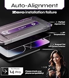 2-PACK Ultra-Durable Tempered Glass: Designed for iPhone 14 Pro; Top Ultra-Durable 9H Tempered Glass for Superior Protection; perfect for Apple iPhone 14 Pro screen protector EASY Installation: Innovative Auto-Dust & Alignment Kit ensures Perfect, Bubble-free Application; Easy Installation for iPhone 14 Pro Glass Screen Protector and for iPhone 14 Pro Screen Protector ULTRA RESISTANT: Military-Grade Tempered Glass offers unmatched Shatterproof and Scratch-Resistant Performance; ideal for iPhone Screen Protector 14 Pro and for tempered glass iPhone 14 Pro- Ultimate Protection CRYSTAL CLEAR HD and Touch Sensitivity: True HD Clarity and Touch Sensitivity; preserves Original Viewing Quality and Responsiveness; Perfect for iPhone 14 Pro Tempered Glass and for iPhone 14 Pro Screen Protector Pre-Installed Glass - With the pre-installed Glass Screen Protector, you can enjoy a Perfect, Bubble-Free Application. Simply peel off the sticker, place it on your phone using the tray, and press.