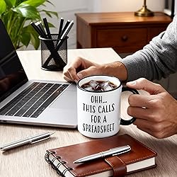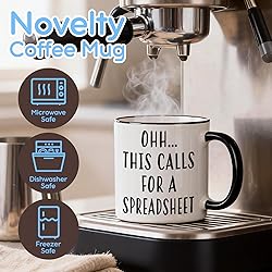 A thank-you humor gift for a colleague: The cup is printed with the clear slogan 'Oh This Calls For A Spreadsheet'. I hope that every time she uses it, she will remember the pleasant times we shared at work. Multifunctional, durable and safe: 3.74 inches high, 3.15 inches caliber, 11oz, large handle for easy grip. Made of high-quality ceramic with a smooth surface that resists fading and wear. Microwave and dishwasher safe. In addition to drinking, it can also be used as a home kitchen decoration, a pen holder or small potted plant on the office desk, and other ingenious uses! Safe and simple gift box packaging: Each mug comes in an elegantly designed box that protects it during shipping, showcases elegance, and is ready to gift right out of the box. Top Gift Choice: Our mugs are perfect for giving to your dad, mom, grandparents, uncles, aunts, siblings, teachers, friends, colleagues, bosses, doctors, nurses, lawyers, and anyone else you want to thank on various occasions such as birthdays, Christmas, Thanksgiving, anniversaries, Valentine's Day, Mother's Day, Father's Day, Halloween, weddings, engagements, retirements, parties, and more. Affordable & Cherished Keepsake: Treat yourself or surprise someone special! This noåvelty gift is both budget-friendly and memorable, sure to be appreciated for years.