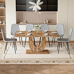- The dining room table set for 6 brings farmhouse style and modern design to your home. This 63" Rectangular Dining Table features a durable wood tabletop with a sturdy modern base, paired with 6 Upholstered Chairs for comfort and support. Perfect for kitchens, dining rooms, or apartments, this 7 Piece Wood Dining Table and Chairs Set is easy to clean, space-saving, and ideal for family meals or gatherings.