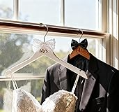 Mr. and Mrs. Wooden Bride Hanger, Wedding Dress Hangers for Bride with White Bow - Groom's Hanger with Black Bow Tie - Set of 2 (White + Vintage)