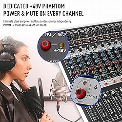 16-Channel Mixer with Bluetooth & USB Playback: This 16-channel audio mixer integrates Bluetooth streaming, U-disk playback, and a digital display player for flexible music input. Each channel features independent gain, 3-band EQ, and an individual mute button for quick track switching in live, karaoke, or studio scenarios. The master section includes a precise 7-band graphic EQ for total sound shaping. Built-In 99 DSP Effects for Versatile Applications: Equipped with 99 built-in DSP effects, including reverb, delay, and ambience, this mixer allows you to tailor sound for live shows, DJ events, karaoke, rehearsals, and small performances. Switch between effects seamlessly to match different environments and enhance overall audio quality. 48V Phantom Power: The upgraded hybrid input jack supports 48V condenser microphones, dynamic mics, wireless systems, electric guitars, DI boxes, and other instruments. Simply press the +48V phantom power switch when using condenser microphones to ensure proper power supply and optimal sound pickup. Stable Bluetooth Wireless Streaming: Built-in Bluetooth connects quickly with mobile phones and smart devices within a 33 ft range. Onboard MENU and control buttons allow you to play, pause, skip tracks, and switch modes directly from the mixer—making wireless audio input simple and efficient. Professional EQ Control & Wide Input Compatibility: Each channel provides a 3-band EQ (High/Mid/Low) and dedicated fader for precise tone control. Master output, monitor, and effect level adjustments deliver accurate and clean sound across your mix. Supports MIC, line, XLR, 1/4" inputs, musical instruments, and headphones—ideal for live mixing, home studios, karaoke, and small venues.