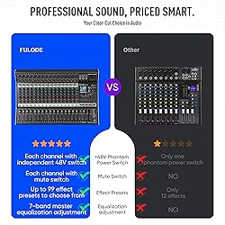 - FULODE 16-Channel Audio Mixer with 99 DSP, Professional Audio Console Digital Sound Music Mixing Board DJ Mixer w/ USB Input Bluetooth MP3 48V Power Supply Mute Function for Studio Live Performance
