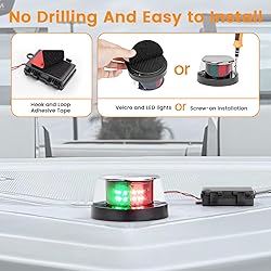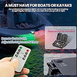 【Battery-Powered, No Wiring Required, Easy Installation】 Powered by 3 AA batteries (with a battery box), eliminating the need for complex wiring and allowing for easy battery replacement, ideal for DIY users. Quick and simple installation. Note: Battery is not included 【Meets USCG Standards with 2 Nautical Mile Visibility】 This navigation light meets US Coast Guard (USCG) standards, providing a 2 nautical mile (approx. 3.7 km) visibility range, ensuring you remain visible and safe during nighttime navigation or low-visibility conditions. 【Flexible Mounting Options, No Drilling Required】 The battery box is installed with double-sided adhesive tape, while the light can be mounted using either double-sided adhesive tape or screws, preventing the need for drilling, protecting the boat's surface. Note: Battery is not included 【REMOTE CONTROL WITH TIMER & ADJUSTABLE BRIGHTNESS】 Control the light remotely for added convenience; the timer prevents battery drain if you forget to turn off the light when leaving the boat, while adjustable brightness meets various navigation needs and extends battery life. 【 Innovative LED Optical Design, Ensures Brightness and Longevity】 Features innovative LED optical design that guarantees high brightness while minimizing heat generation, extending the light’s lifespan, making it perfect for long-distance nighttime boating. 【Durable Aluminum Housing, Energy Efficient】 The light features a durable aluminum housing, resistant to corrosion, and has passed a 72-hour salt spray test, making it ideal for harsh marine environments. With only 6W of power consumption, it’s energy-efficient, extending battery life and reducing power usage. 【IP67 Waterproof Design for All-Weather Protection】 With an IP67 waterproof rating, the light operates reliably in extreme weather and damp conditions, preventing water ingress and short circuit issues, perfect for marine and lake environments. 【Battery-powered nav lights to the rescue!】 No need to fix faulty wiring—clip on, power up, and stay compliant & visible on the water.