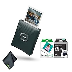 Bundle Includes: FUJIFILM INSTAX SQUARE LINK Smartphone Printer (Midnight Green) + FUJIFILM INSTAX SQUARE Monochrome Instant Film (10 Exposures) + Fujifilm instax SQUARE Instant Film (20 Exposures) + Diginerds Microfiber Cleaning Cloth Creative Editing and AR Features: Customize your prints with over 1600 in-app stickers, decorative frames, and drawing tools before printing. Add a scannable QR code for Augmented Reality effects, letting you overlay animations, messages, or fun graphics on your print for an interactive experience that brings your photos to life. Fast and High-Quality Output: With a sharp 800 x 800 dpi resolution and smooth 256-color gradation, each print delivers clear detail and vibrant tones. Images are ready in about 12 seconds, making it perfect for events, creative projects, or everyday moments when you want instant, high-quality prints with minimal wait time. Rechargeable and Travel-Ready: Compact and lightweight, this printer is built for portability. A fully charged internal battery prints up to 100 images and recharges via the included USB-C cable in 80 to 120 minutes. Take it anywhere to share physical prints instantly without worrying about frequent recharging. Wireless Smartphone Printing: Easily print square photos straight from your smartphone using Bluetooth 4.2 and the free INSTAX SQUARE LINK app. Capture memories from photos or videos and produce vibrant 2.44 x 2.44-inch prints in seconds. Designed exclusively for INSTAX SQUARE instant film, it offers a seamless and portable way to create keepsakes wherever you go.